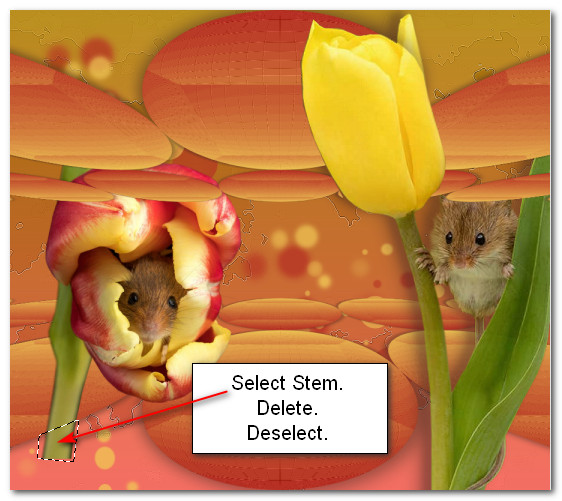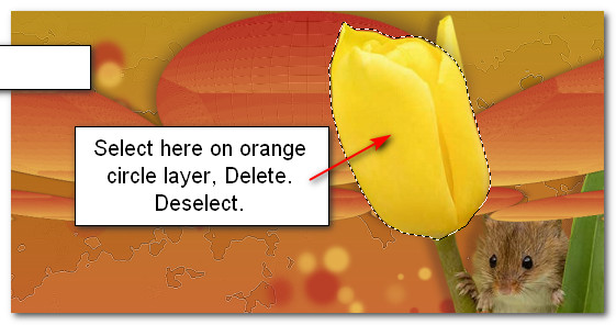 22. Highlight duplicate layer of orange circles. Using Free Hand Selection tool set to Point to Point, Add (Shift), Feather 0, select around tulip, press Delete key to remove orange circles off from tulip. Deselect.