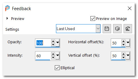 It is important to note that some foreign PSP programs are giving different results with their Plugins effects. In this tutorial, Step #5 gives a different result than my English program and therefore the following steps are not correct either. To solve this problem, you may copy/paste as new layer the Layer 2 I have included in the Materials. Another way to solve this issue, thanks to my tester Pamela and my French translator Lili, they say to place the lady 5 or 6 pixels away from the bottom left edges of the image so when Step #5 Feedback is applied, the end result is correct.