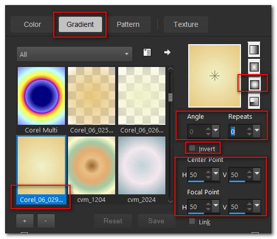 1. In Materials Palette, set Foreground to #f0f1c9, Background to #e7c77d. Set Style to Sunburst, Invert unchecked, Gradient to Corel_06_029 foreground-background, Angle/Repeats at 0, Center and Focal Points all at 50.