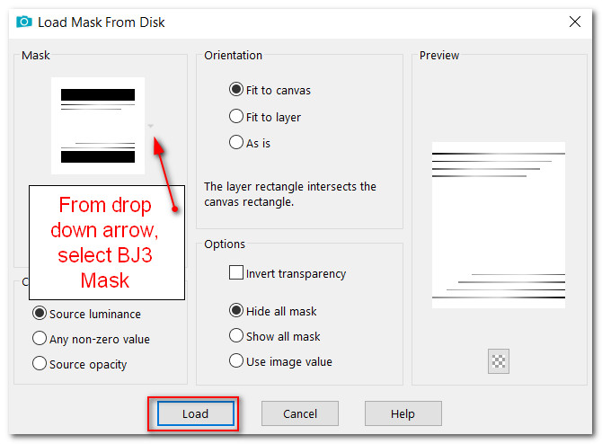 4. Layers/Load/Save Mask/Load Mask from Disk. From drop down arrow, select Mask BJ3. Load.