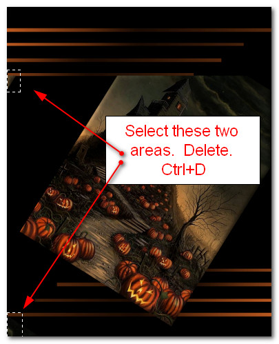 12. Using Selections tool set to Rectangle/Add(Shift)/Feather 0, surround the excess areas as shown below. Delete. CTRL+D.