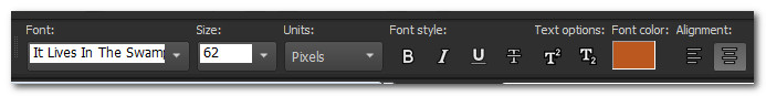 21. From the tool bar choose the Text tool. Select Font "It Lives In The Swamp (BRK)", Size 62, Stroke width 0.0, color #000000, Kerning 25.