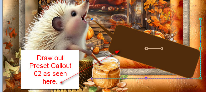 43. From the tool bar select the Preset Shapes tool. Select the Preset Callout 02. Start near the Hedgehog's mouth and draw out a rounded rectangle. Use the turn node and shape nodes to create a rounded rectangle as seen here. Adjust as needed to place it on a slant and change size/make wider or longer if necessary.