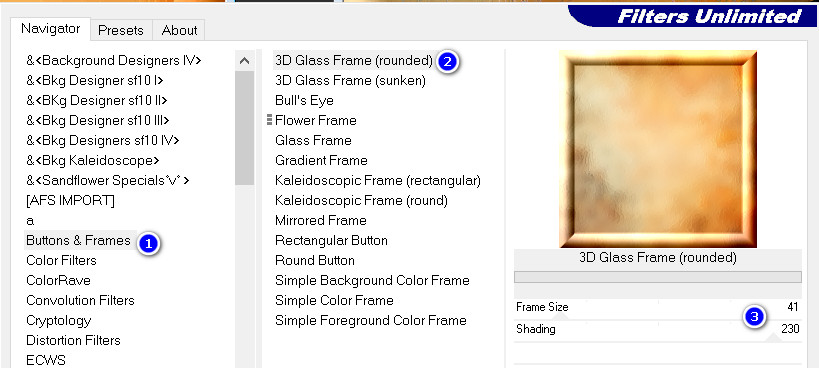 13. Effects/Filters Unlimited/Buttons&Frames/3D Glass Frame (rounded). Frame size 41/Shading 230.