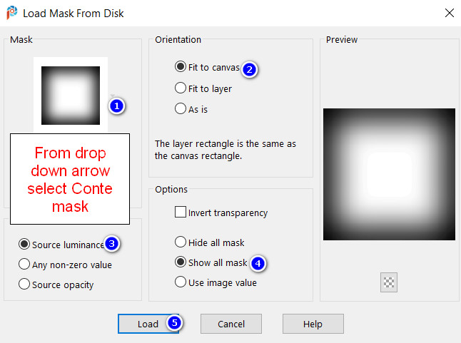 24. Layers/Load/Save Mask. Load Mask From Disk. From the drop down arrow select Conte Mask. Load.