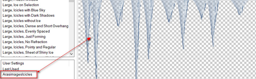 22. Effects/Alien Skin Eye Candy 5: Nature/Icicles. Select Arasimagesicicles from Settings. Click OK. Deselect.