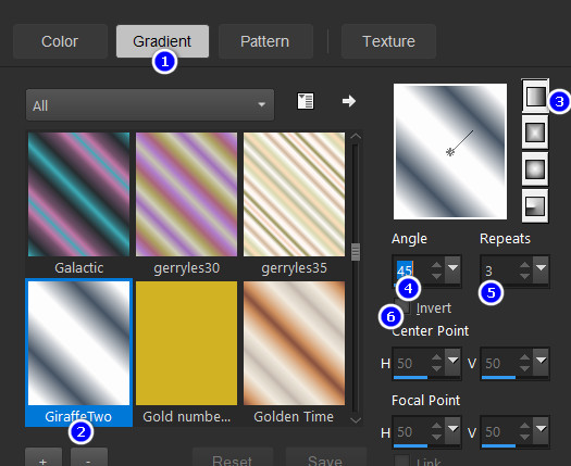 29. In Materials Palette, create a gradient by selecting the Linear style, Gradient GiraffeTwo, Angle/45, Repeats/3, Invert unckecked.
