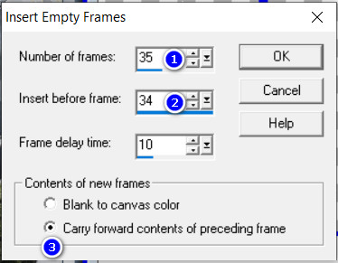 38. From top tool bar under Animation/Insert Frames/Empty, in the box for Number of frames you will add 35 as you want to have 36 frames in all to match the frames of the snow. It will read Insert before frame 34, thus we will end up with 36 frames. This may seem strange to put those numbers in to get your desired results, but it works!