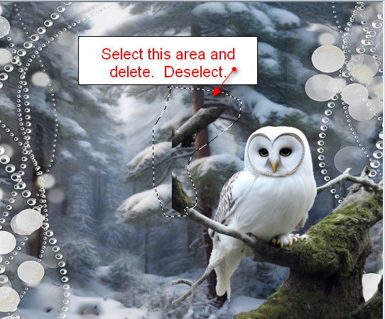 13. Using Freehand Selections/Point to point, Mode: Add (Shift), Feather 1, Anti-alias checked, select the piece of branch which is in midair and the end of the branch the owl is sitting on. Delete. Deselect.