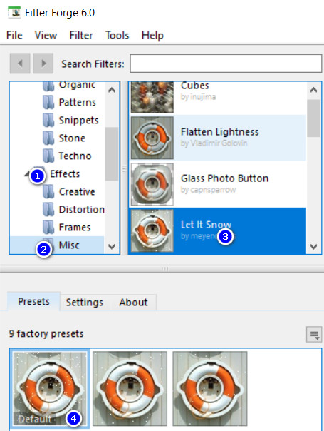 10. Effects/Filter Forge 6.0/Effects/Misc/Let It Snow, set to Default.