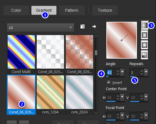 1. In Materials Palette, set Foreground to #b45f48, Background to #f5f7f9. Select Linear, Corel_06_029 Foreground-Background Gradient, Angle 45/Repeats/3, Invert checked.