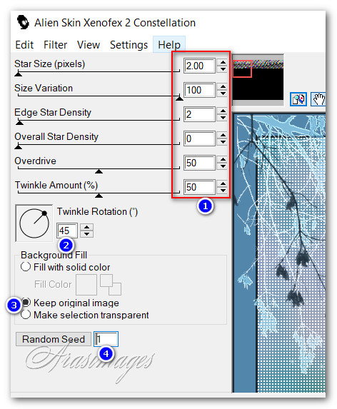 55. Effects/Alien Skin Xenofex 2/Constellation. Click on Random Seed to change setting. Click OK.