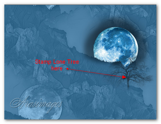 21. Change foreground color to #9a9a98. Left click two times to stamp larger tree between left moon and dark tree.