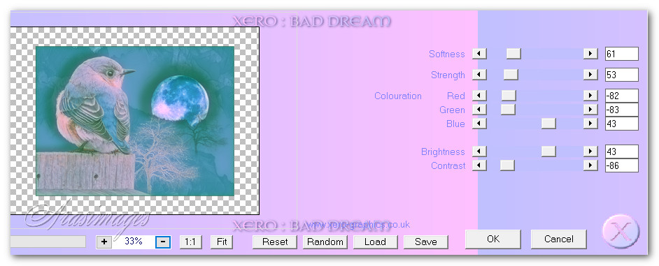 Create a folder on your desktop named Bluebird at Midnight. Unzip the Materials into this folder. I have used the plugins PicToPainting/Watercolor, Alien Skin Xenofex 2/Constellation, AFS IMPORT/sqborder2 and Xero/Bad Dream along with effects of PSP. Export the 5 Dots.PspBrush, the Lone Tree.PspBrush and Tree Borders III_2.png into your PSP Files/Brushes folder. Animation Shop was also used for the animation which is optional for this tutorial. *For those who are not used to taking short cuts, I use CTRL+A for Selections/Select All, CTRL+C for Copy, CTRL+V for Paste and CTRL+D for Deselect. I will use some in this tutorial.* This tutorial was written using PSP2020. To work this tutorial, it is assumed you have some working knowledge of Paint Shop Pro.