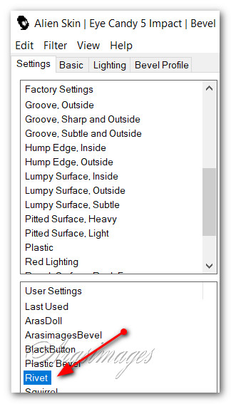 17. Effects/Alien Skin Eye Candy 5 Impact/Bevel. Click on Rivet under Settings. Click OK.