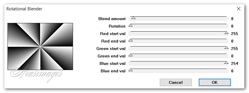 8. Using the Selections tool set to Rectangle/Add (Shift)/Feather 0/Anti-alias checked. Select the top half of the Rotational Blender layer. Delete. Deselect.