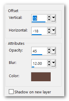 43. Effects/3D Effects/Drop Shadow. Vertical 15, Horizontal-18, Opacity 45, Blur 12, Color #64463c.