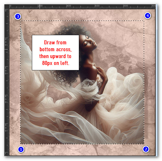 15. Using the Selections tool set to Rectangle/Add (Shift)/Feather 0, draw a rectangle around the woman starting at bottom going to top, using the View/Rulers setting for numbers, have the top left corner set to 800px. See snapshot below.